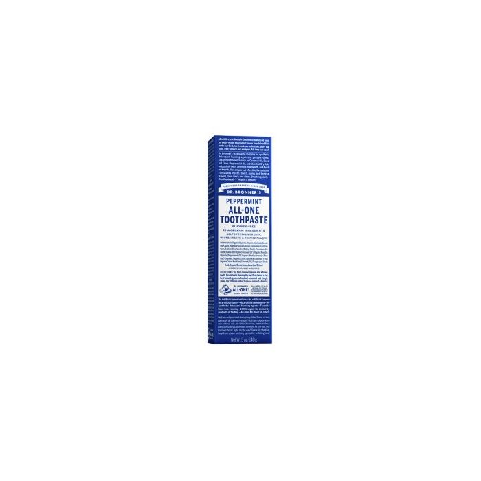 Introducing Dr. Bronner's All-One Toothpaste with 70% organic ingredients! Our low-foaming formula has no synthetic detergent foaming agents, is fluoride-free, vegan and cruelty-free, with no artificial colours, flavors, preservatives, or sweeteners ‐ none! This simple yet effective toothpaste stimulates mouth, teeth, gums and tongue, leaving them fresh and clean. Made in a 100% recyclable box and tube. Available in peppermint, cinnamon and anise flavors.