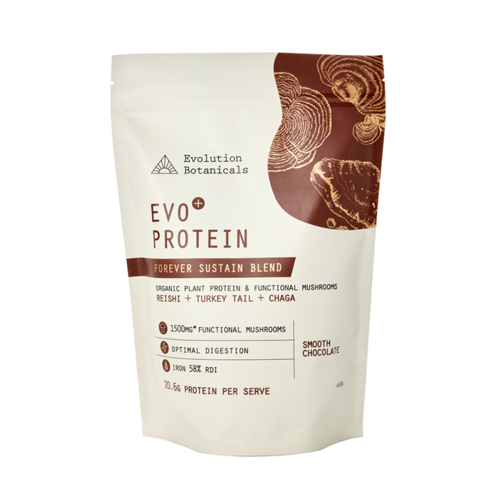 Our Evo+ Protein offers an easy way to supplement your diet and satisfy hunger whilst benefitting from the powerful benefits of functional mushrooms. Our Forever Sustain Blend mixes smoothly into a naturally sweet, delicious shake or can be easily used as an ingredient for special treats. The certified organic Canadian golden pea and hydrolysed rice protein has a complete amino acid profile and is supercharged with Reishi, Turkey Tail and Chaga. You also achieve optimal digestion and absorption due to Bromelain, a naturally occurring enzyme derived from pineapple, and Bacillus coagulans, a heat-stable probiotic that is non bloating and supports gut health. Contents 450g, stand up pouch with resealable zipper. Serving size 30g, servings per pouch 15.