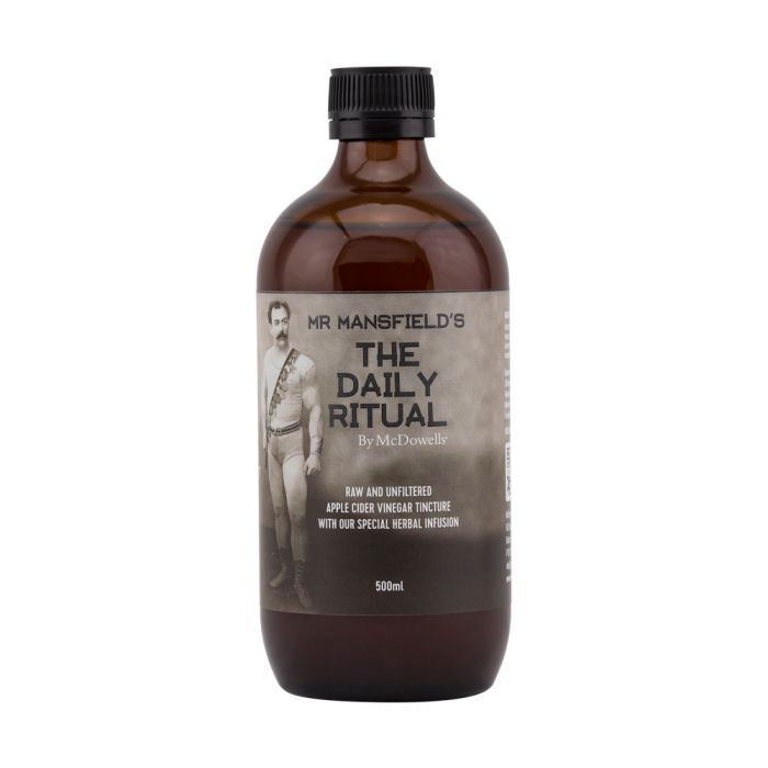 Mr Mansfield’s - The Daily Ritual, is made with raw, unfiltered apple cider vinegar steeped for a minimum of eight weeks with herbs like echinacea, yarrow, dandelion and turmeric. For extra oomph, we add fresh lemon, raw honey and Bach Flower Essences, resulting in a great tasting tonic that builds whole-body wellness, everyday.